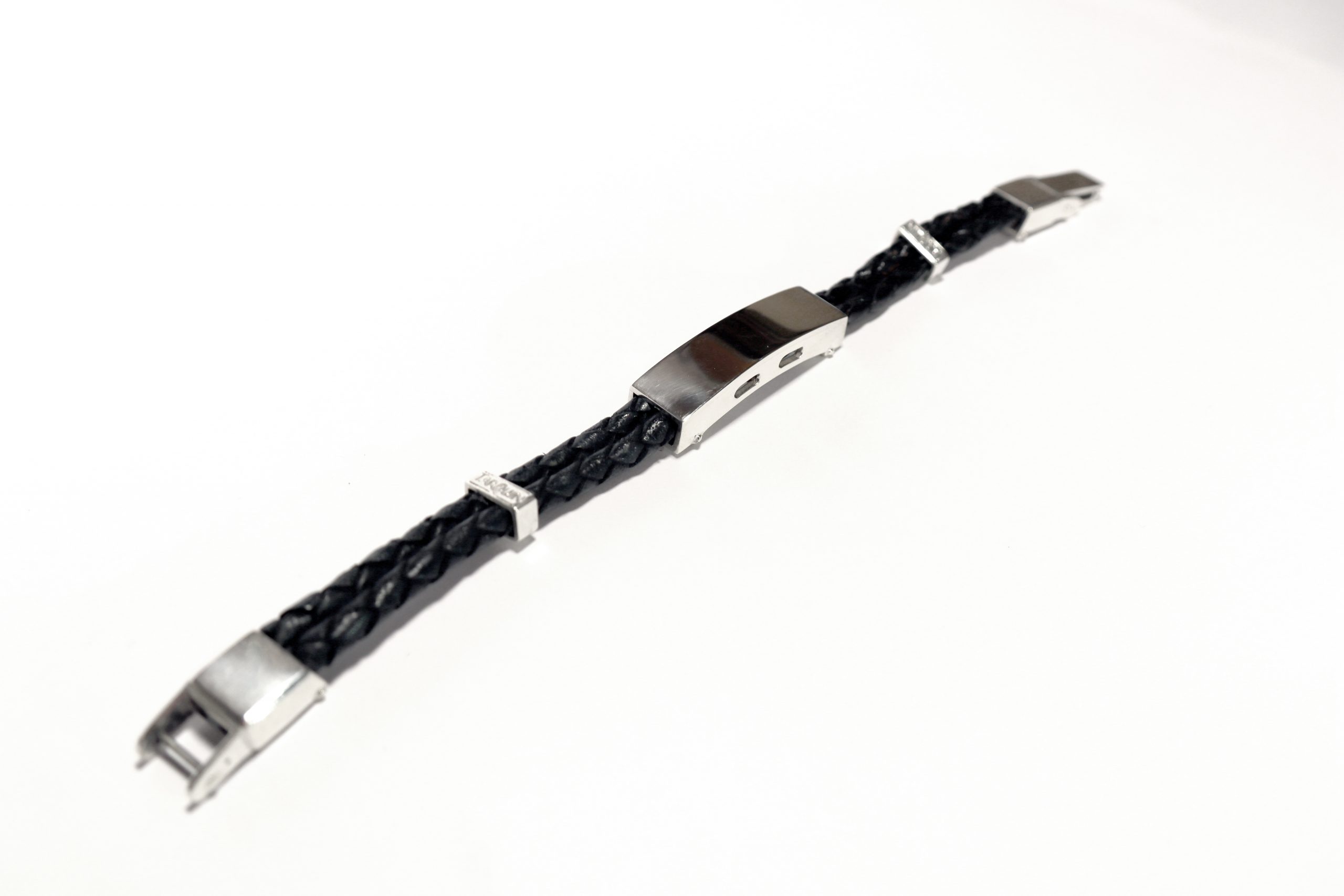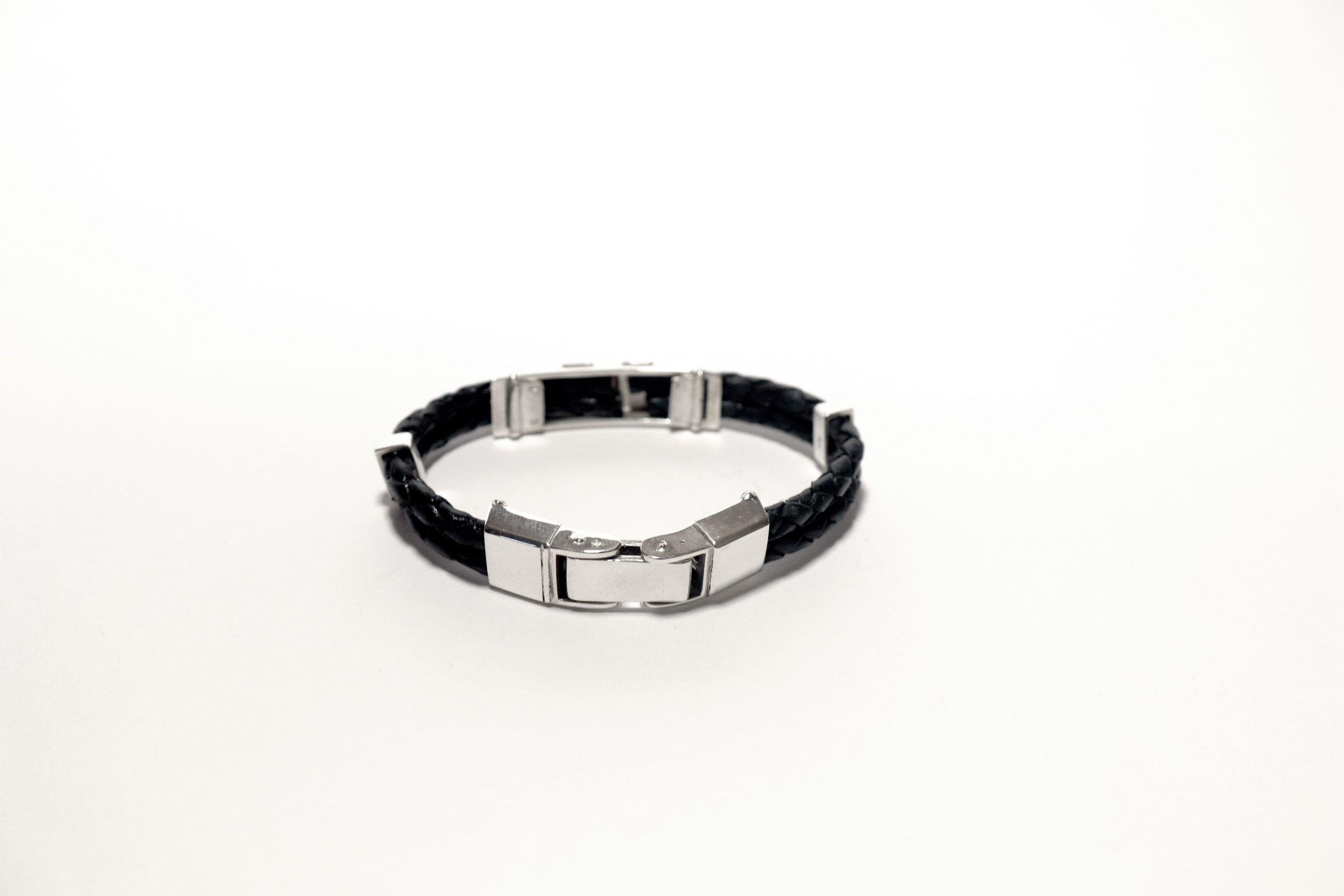 A high quality black leather and silver bracelet handmade at Tarquins Exclusive Jewellery.
