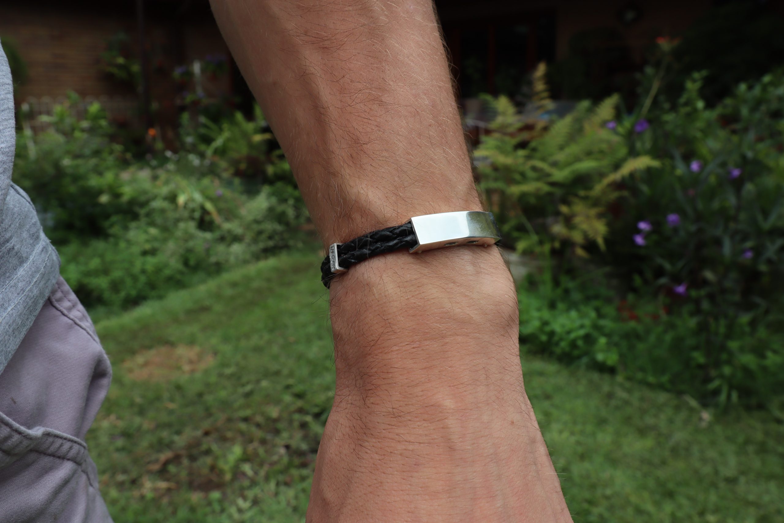 No glue is used to attach the leather- which provides for a long lasting bracelet and strap mechanism. The bridged center plate and clasps are made with over 2/3 an ounce of sterling silver and is fully engravable.